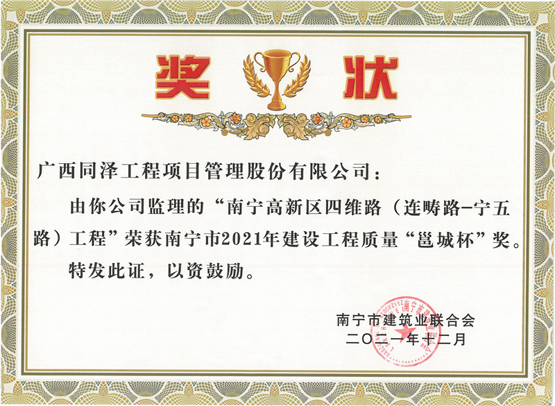 南寧高新區四維路(連疇路-寧五路)工程榮獲南寧市2021年建設工程質量“邕城杯”獎